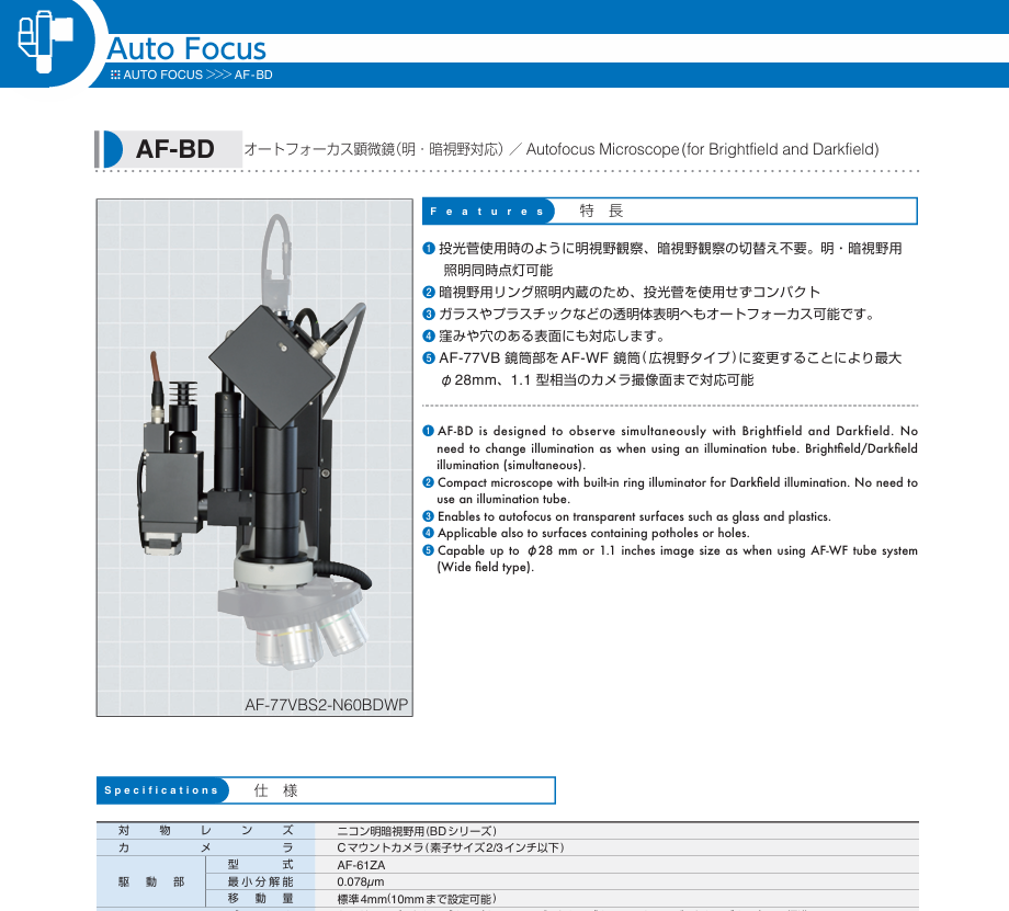 라인센서 방식 오토포커스로 유리·플라스틱 등 투명체 표면과 홈/구멍이 있는 표면에도 안정적으로 합초가 가능하며, 니콘 CFI60(BD 시리즈) 대물렌즈와 C마운트(2/3" 이하) 카메라에 대응합니다.