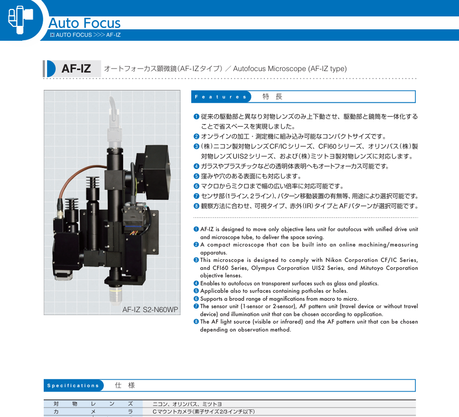 AF-IZ는 대물렌즈만 상하 구동시키는 구조로 구동부와 경통을 일체화해 설치 공간을 줄인 내장형 오토포커스 현미경입니다.