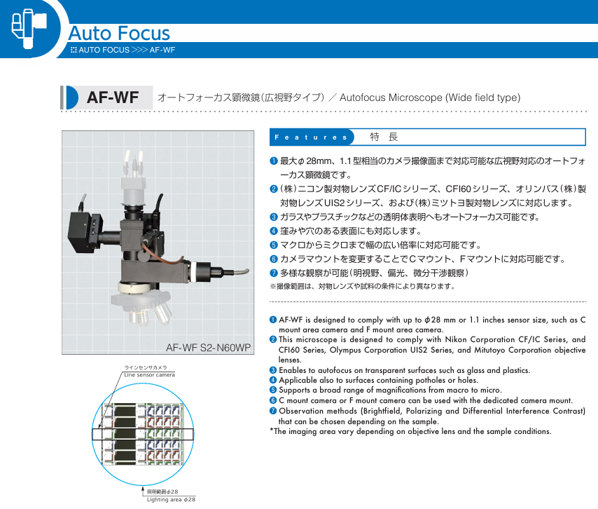 라인센서 방식 오토포커스를 적용해 표면에 홈·구멍(단차/요철)이 있는 시료에서도 합초가 가능하며, 유리·플라스틱 등 투명체 표면에도 안정적으로 자동초점을 지원합니다.