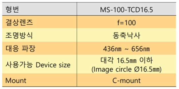f=100mm 결상계를 기반으로 소형 시스템 인테그레이션에 유리하며, Image circle Ø16.5mm(대각 16.5mm 이하) 범위의 센서를 커버합니다.
