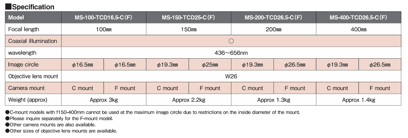 초점거리 f=150mm 결상 광학계를 기반으로 장비 내 공간이 제한된 시스템에서도 유연한 레이아웃 구성이 가능하며, 이미지서클 Ø25mm 이하를 커버하여 다양한 카메라 센서에 대응합니다.