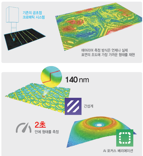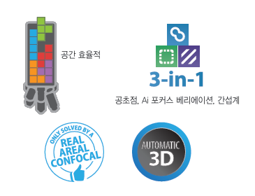 또한 하나의 헤드에 공초점(Confocal) + Ai 포커스 베리에이션 + CSI(간섭계) 3가지 측정 기술을 탑재해, 대상 표면/작업 조건에 따라 최적의 기법으로 스캔 및 3D 데이터를 취득할 수 있습니다.