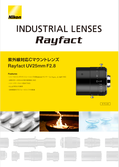 Rayfact UV25mm F2.8은 200~400 nm 자외선(UV) 영역에 대응하는 C-마운트 렌즈로, F2.8의 높은 광량을 확보하면서도 사용 파장대 내 포커스 시프트를 저감해 안정적인 UV 이미징을 지원합니다.