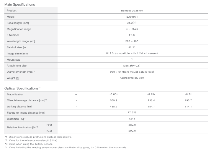 최대 1.2형(이미지서클 φ19.3 mm)까지 커버하며, IMX487(2.74 µm, 8.1MP)급 센서에 최적화된 설계로 UV 관찰/검사/계측 시스템에서 선명한 재현성과 운용 편의성을 제공합니다.