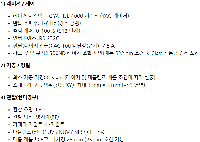 L300ND 레이저 조합 사양에서는 Class 4 레이저 사용을 전제로, Soft interlock 연동 및 셔터/스위치 기반 안전 조건을 포함합니다.