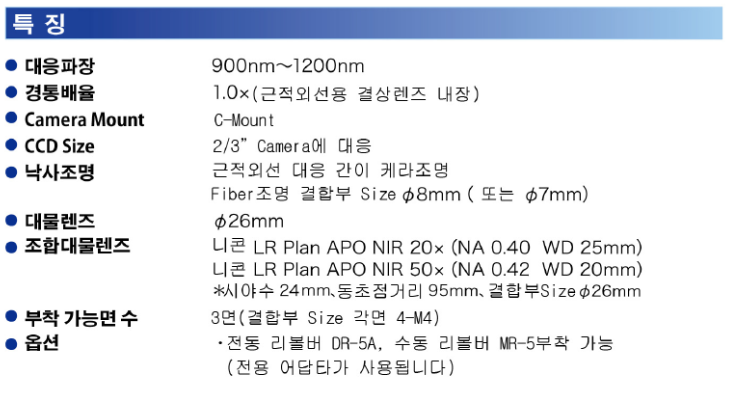 NIR 낙사(에피) 조명과 파이버 조명 결합(φ7/φ8mm)을 지원하며, φ26mm 대물계(예: Nikon LR Plan APO NIR 20×/50×)와 조합해 근적외선 검사/측정 시스템 구성에 적합합니다.