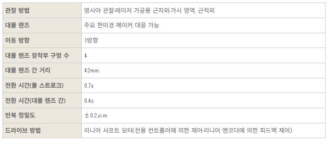 개요 특징 스펙 카탈로그 Objective SliderLinear Motor Type(4구) 개요 AF-OLS-04L-MS AF-OLS-04L-MS는 대물렌즈 4개를 슬라이딩 방식으로 자동 전환하는 리니어 타입 모터 구동형 슬라이더입니다.고정밀 볼스크류와 크로스 롤러 가이드 구조를 적용하여 ±1 µm 반복 정밀도를 확보하며, 대물렌즈 간 간격은 42 mm로 설정되어 있습니다소형화된 단방향 구동 구조로 레이저 가공, 검사 및 측정 시스템 등 장비 내장용 모듈에 적합하며, 전용 컨트롤러(QT-ADL1(K)-AC, RS-232C 원격제어)와 함께 사용합니다. 특징 스펙 카탈로그 중앙정기 AutoFocus Unit