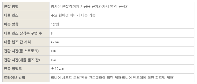 개요 특징 스펙 카탈로그 Objective SliderLinear Motor Type(6구) 개요 AF-OLS-06L-MS AF-OLS-06L-MS(리니어 6구)는 대물렌즈 6개를 직선(Linear) 슬라이딩 방식으로 자동 전환하는 스테퍼 모터 구동형 Objective Slider입니다. 반복 정밀도가 필요한 자동화 장비에서 배율/관찰 조건을 빠르게 전환할 수 있도록 설계되어, 레이저 가공·수리, 자동 검사/측정 시스템 같은 장비 내장용 모듈로 적합합니다. 특징 스펙 카탈로그 중앙정기 오토포커스 카탈로그