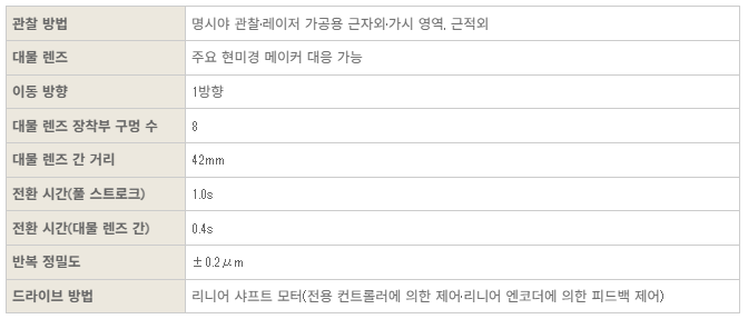 개요 특징 스펙 카탈로그 Objective SliderLinear Motor Type(8구) 개요 AF-OLS-08L-MS AF-OLS-09L-MS(리니어 8구)는 대물렌즈 8개를 직선(Linear) 슬라이딩 방식으로 자동 전환하는 고정밀 스테퍼 모터 구동형 슬라이더입니다. V-그루브 + 크로스 롤러 가이드 구조로 높은 반복 정밀도(±1 µm)를 보장하며, 다중 배율 전환이 필요한 고배율 검사·레이저 가공·측정 장비 내장용으로 설계되었습니다. 컨트롤러는 RS-232C 원격 제어 및 스텝 모터 드라이버 일체형 구성으로 시스템 통합이 용이합니다 . 특징 스펙 카탈로그 중앙정기 AutoFocus Unit 카탈로그