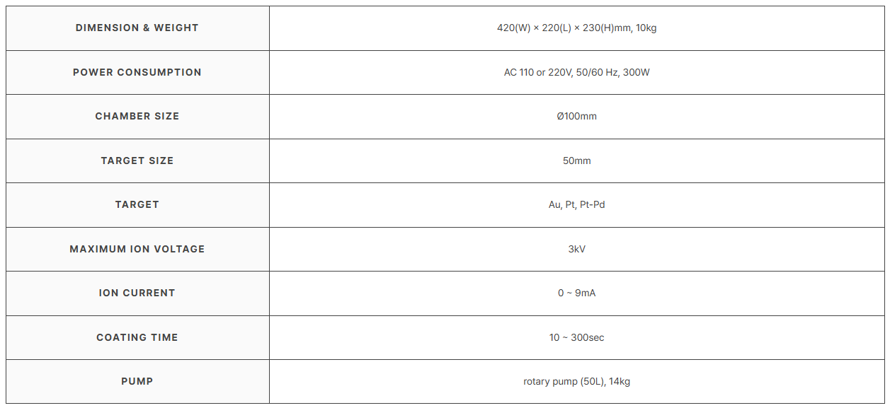개요 스펙 카탈로그 SEMIon Sputter Coater SPT-20 개요 이온 코터 SPT-20은 DC 스퍼터링(직류 스퍼터링) 원리를 이용해 시료 표면에 전도성 금속(Au, Pt, Pd, Pt-Pd)을 코팅하는 장비입니다. 비전도성 시료도 전자현미경 관찰을 위해 코팅이 필요하며, 코팅층은 전자빔 주입으로부터 시료 표면을 보호하고 전하(전자) 흐름을 원활하게 해줍니다. 또한 박막 형태의 전극 형성 용도로도 사용할 수 있습니다. 디지털 이온 코터 진공 코팅: 원터치로 대기압(정상 압력)까지 복귀 가능한 코팅 시스템 코팅 전류 피드백 기능을 통한 안정적인 코팅 다양한 금속 타깃(타겟) 사용 가능 저노이즈 로터리 펌프 사용 스펙 카탈로그 Ion Sputter Coater SPT-20 카탈로그