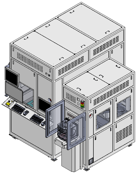 본 장비는 EFEM 기반, 300mm 웨이퍼 검사 시스템으로, 좌측 메인 챔버에 니콘 NEXIV 계측/검사 모듈과 vacuum stage를 탑재하고, 우측에는 Load Port(FOUP), 로봇 암(이송 로봇), Pre-Aligner(웨이퍼 방향 정렬), OCR 등 전면 이송·정렬·인식 기능을 통합한 구조입니다.