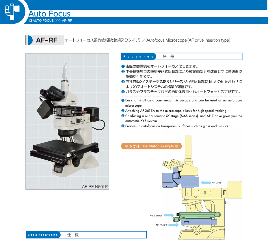 중앙정기(中央精機) 고유의 슬림한 차입식 Z구동부(AF-261ZA)를 적용해 미동부를 크게 손대지 않고 고속 추종 합초(라인센서 방식)가 가능하며, 유리·플라스틱 등 투명체 표면에도 오토포커스가 됩니다.