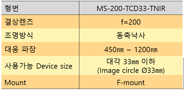 MS-200-TCD33-TNIR은 f=200 결상렌즈 기반의 F-mount 튜브렌즈 모듈로, 동축낙사(에피) 조명 방식을 적용한 관찰/검사용 라인업입니다.