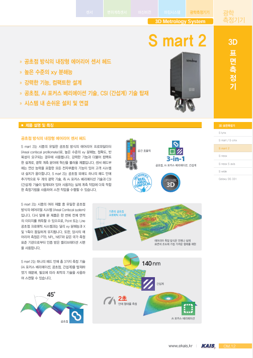 S mart 2는 공초점 방식의 내장형 에어리어 센서 헤드를 적용한 3D 표면 프로파일미터로, 한 번에 전체 면적 이미지를 취득하여 X·Y 분해능이 동일하게 유지되는 것이 특징입니다.