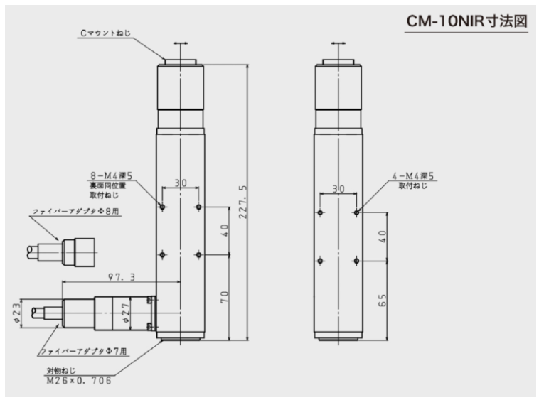 CM-10NIR은 900~1200nm 근적외선(NIR) 관찰을 위한 1.0× 경통(근적외선용 결상렌즈 내장)으로, C-mount 기반으로 2/3”급 카메라에 대응합니다.