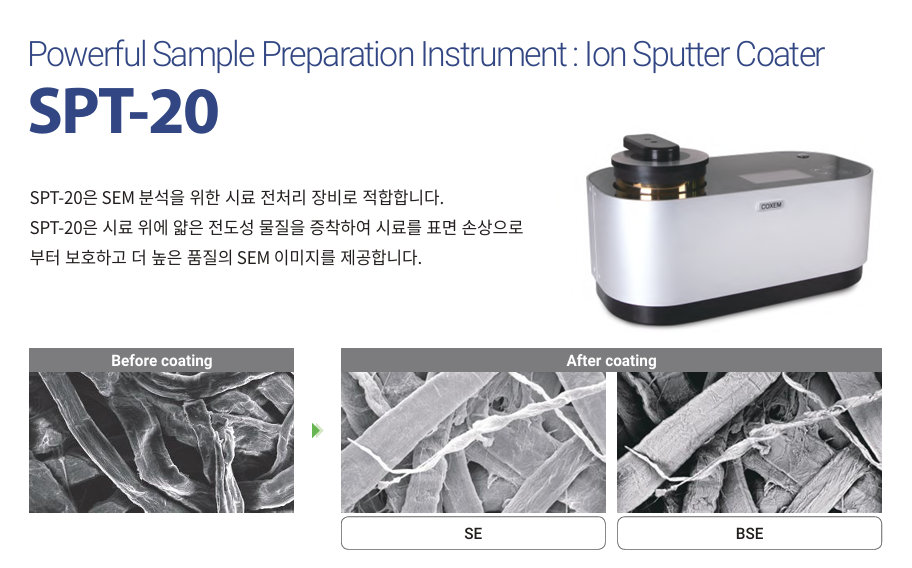 개요 스펙 카탈로그 SEMIon Sputter Coater SPT-20 개요 이온 코터 SPT-20은 DC 스퍼터링(직류 스퍼터링) 원리를 이용해 시료 표면에 전도성 금속(Au, Pt, Pd, Pt-Pd)을 코팅하는 장비입니다. 비전도성 시료도 전자현미경 관찰을 위해 코팅이 필요하며, 코팅층은 전자빔 주입으로부터 시료 표면을 보호하고 전하(전자) 흐름을 원활하게 해줍니다. 또한 박막 형태의 전극 형성 용도로도 사용할 수 있습니다. 디지털 이온 코터 진공 코팅: 원터치로 대기압(정상 압력)까지 복귀 가능한 코팅 시스템 코팅 전류 피드백 기능을 통한 안정적인 코팅 다양한 금속 타깃(타겟) 사용 가능 저노이즈 로터리 펌프 사용 스펙 카탈로그 Ion Sputter Coater SPT-20 카탈로그