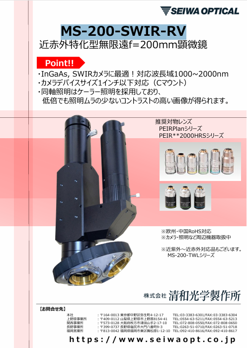 MS-200-SWIR-RV는 SWIR(1000~2000nm) 대역에 특화된 무한대 광학계(f=200mm) 현미경 헤드로, InGaAs/SWIR 카메라 적용에 최적화된 관찰·검사 솔루션입니다.